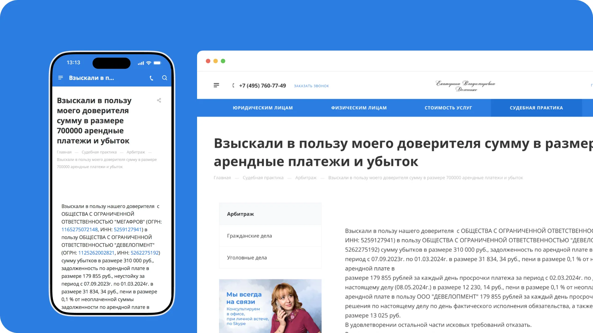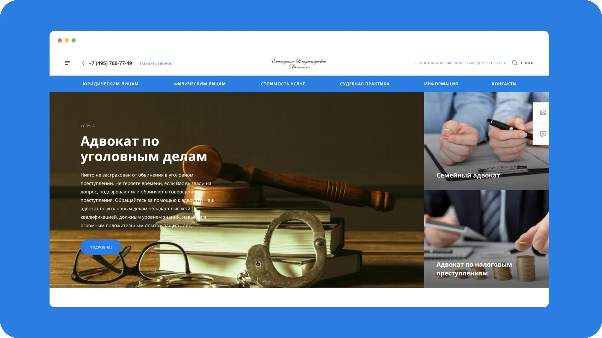 Таким образом, сайт стал не только инструментом для продвижения услуг адвоката, но и важным ресурсом для клиентов, ищущих информацию о праве и судебной практике.