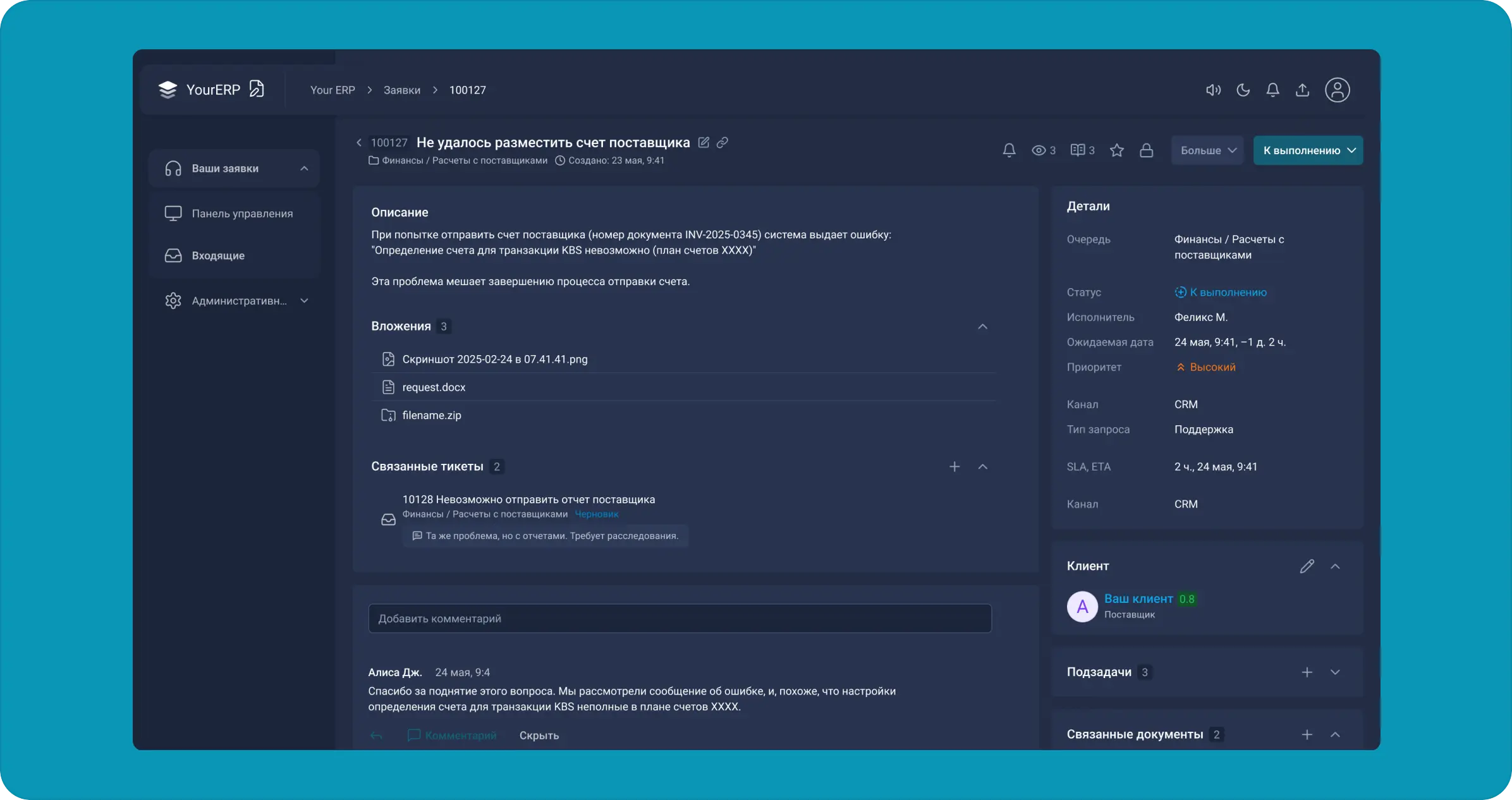 Your ERP объединяет все ключевые бизнес-процессы в одной системе: управление заявками, документооборот, база знаний и аналитика — всё в едином удобном интерфейсе.